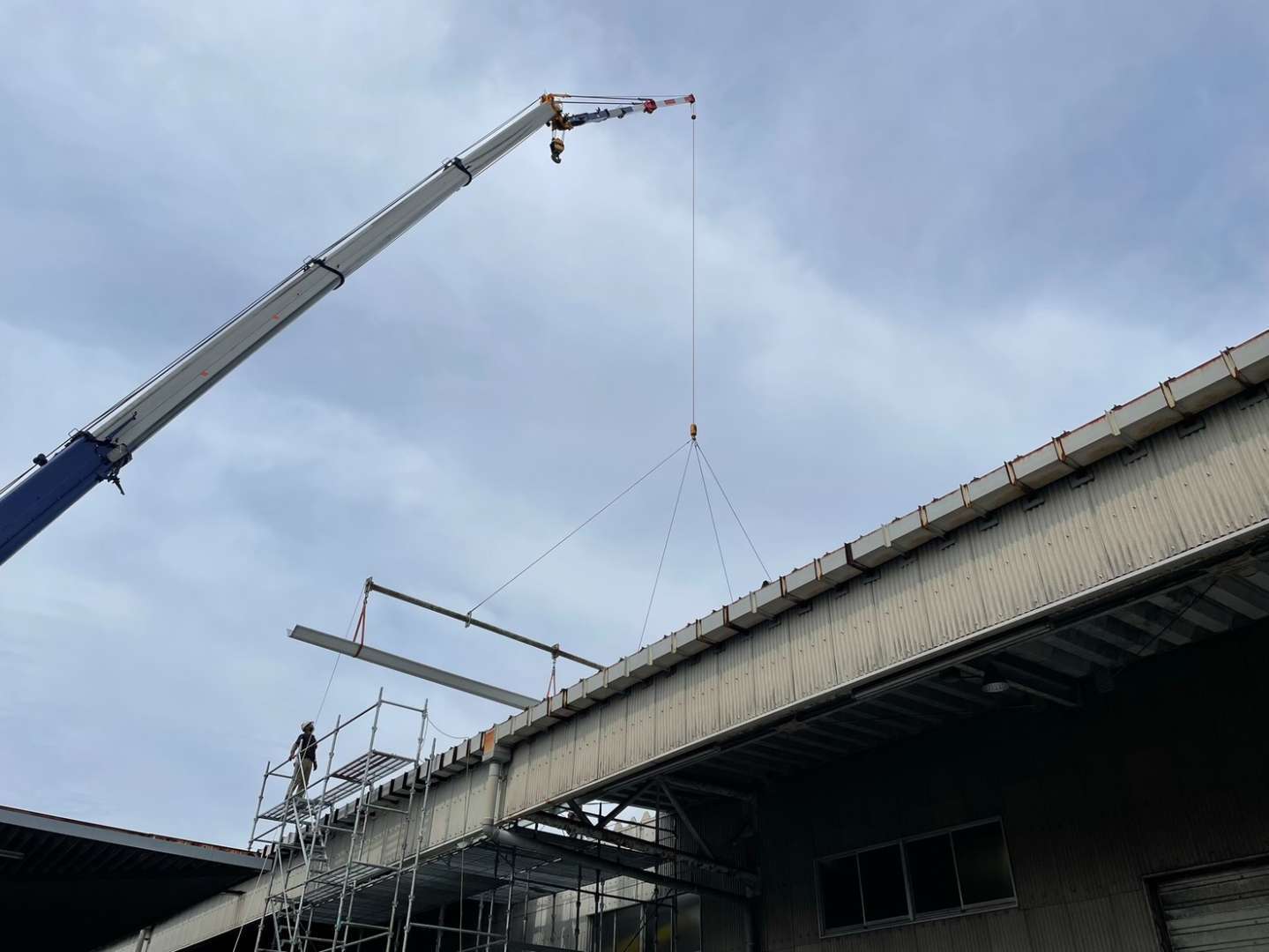 今回は、大型クレーンを使用した防府市内の工場屋根(折板屋根)工事の様子をお届けします。