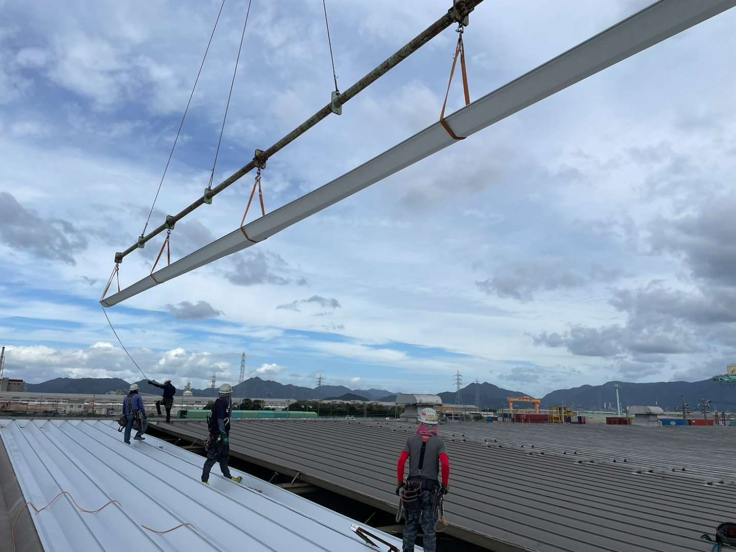 写真の通り、「吊り天秤」という専用の吊り具を使用しています。長尺の折板屋根材を多点で水平に吊り上げることで、資材の「しなり」や「歪み」を完全に防止。安全に配慮し、大型クレーンで確実に屋根上へ揚重しました。
